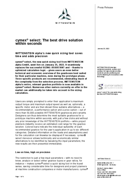 cymex® select, the new quick sizing tool from WITTENSTEIN alpha GmbH, went live on January 25, 2022. It seamlessly replaces the successful SIZING ASSISTANT and – thanks to optimized calculation logic – gives users an even better technical and economic overview of the gearboxes best suited for their particular machine, even during the prototype phase. Three specific products are recommended, eliminating much of the complexity from the selection process. WITTENSTEIN alpha’s entire, relevant gearbox portfolio is now available in cymex® select. Numerous other motors currently on offer in the market can additionally be taken into account in the sizing calculation.