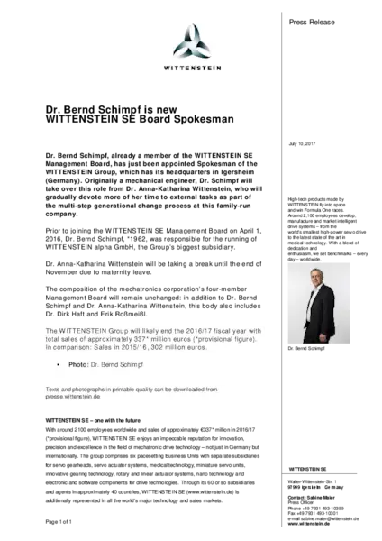 Prior to joining the WITTENSTEIN SE Management Board on April 1, 2016, Dr. Bernd Schimpf, *1962, was responsible for the running of WITTENSTEIN alpha GmbH, the Group’s biggest subsidiary.