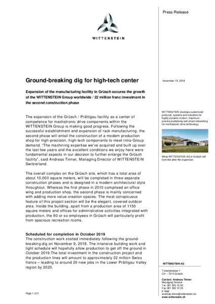 The Grüsch project marks a further milestone in the WITTENSTEIN Group’s expansion plans. “The envisaged investments will not only establish a second pillar at our Swiss site; the intention is also to ensure our future ability to deliver in our core segment. It’s a win-win situation for our Grüsch subsidiary and for WITTENSTEIN as a whole”, emphasized Dr. Anna-Katharina Wittenstein of the WITTENSTEIN SE Management Board in Igersheim (Germany).
