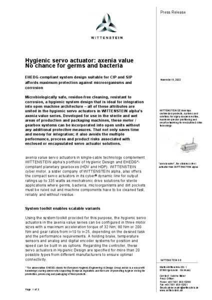 “axenia value”, the enhanced stainless steel actuator in single-cable technology from WITTENSTEIN alpha, complements the Hygienic Design portfolio.