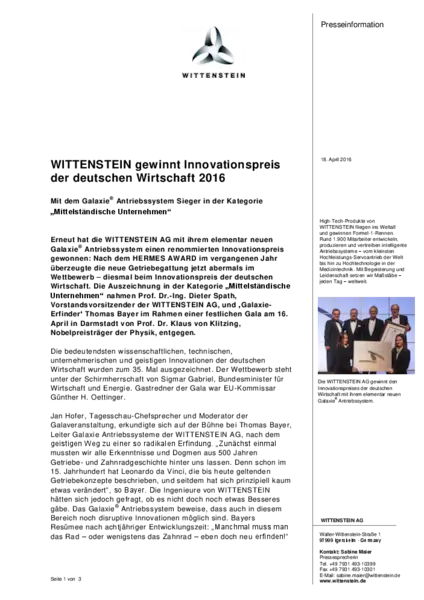 WITTENSTEIN AG is one of four winners of the Innovation Award of the German Economy 2016 alongside Schott AG (“Large Companies” category), Trumpf GmbH and Co. KG (“Industrie 4.0”) and Hydrogenious Technologies GmbH (“Start-Ups”). More information: www.innovationspreis.com