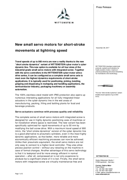 The complete series of small servo motors with integrated screw is designed for use in highly dynamic positioning axes of machines or for installation where space is restricted. The new variant has been specifically optimized for rapid movements of up to 50 mm by modifying the ball screw drive. With a maximum travel speed of 900 mm/s, the “short stroke dynamics” version of the cyber dynamic line is a good alternative to pneumatic cylinders, even in the most highly dynamic applications, so that better, more reliable and more economically efficient machining processes can now be achieved. Unlike their pneumatic equivalent, the small servo motors are not only easy to connect to a higher-level controller. They also allow precise position control – without any retooling on the machine in case of format changes. Another advantage of this servo technology is that it is leakproof and far more energy efficient in normal operation – after all, compressed air is not only expensive to produce but a significant share of it is lost. Finally, the small servo motors with integrated screw are virtually maintenance-free and simultaneously quieter – two further benefits compared to pneumatics.