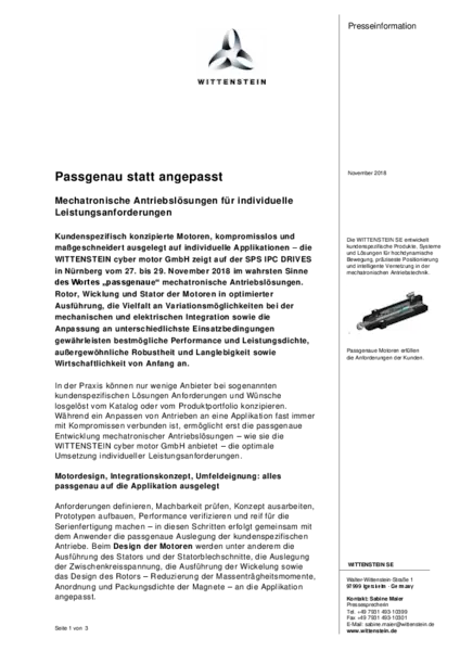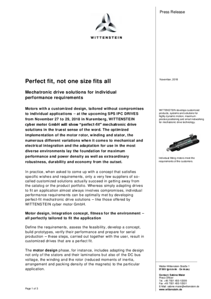 In practice, when asked to come up with a concept that satisfies specific wishes and requirements, only a very few suppliers of so-called customized solutions actually succeed in getting away from the catalog or the product portfolio. Whereas simply adapting drives to fit an application almost always involves compromises, individual performance requirements can be optimally met by developing perfect-fit mechatronic drive solutions – like those offered by WITTENSTEIN cyber motor GmbH.