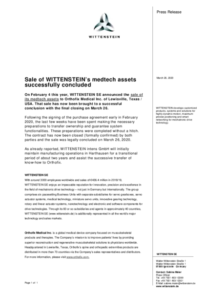As already reported, WITTENSTEIN intens GmbH will initially maintain manufacturing operations in Harthausen for a transitional period of about two years and assist the successive transfer of know-how to Orthofix.