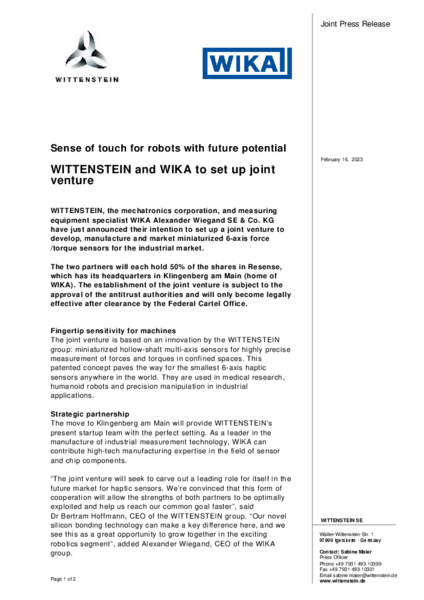 “The joint venture will seek to carve out a leading role for itself in the future market for haptic sensors. We’re convinced that this form of cooperation will allow the strengths of both partners to be optimally exploited and help us reach our common goal faster”, said Dr Bertram Hoffmann, CEO of the WITTENSTEIN group. “Our novel silicon bonding technology can make a key difference here, and we see this as a great opportunity to grow together in the exciting robotics segment”, added Alexander Wiegand, CEO of the WIKA group.