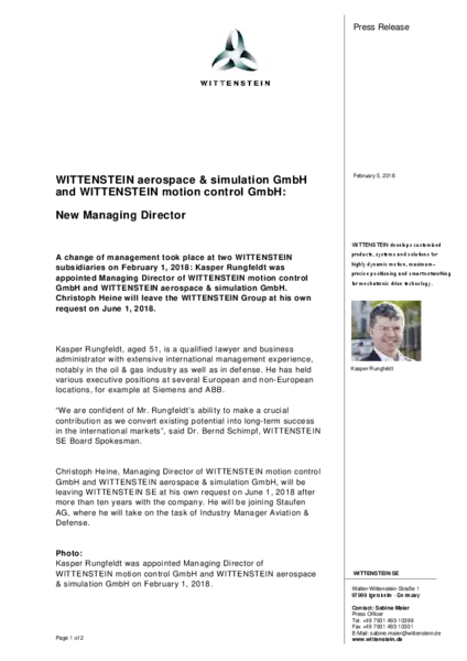 Kasper Rungfeldt was appointed Managing Director of WITTENSTEIN motion control GmbH and WITTENSTEIN aerospace & simulation GmbH on February 1, 2018.