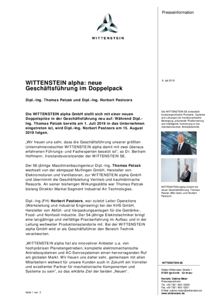 “We are delighted to have found two people with such extensive expertise and experience as managers to take over the helm at our biggest subsidiary”, said Dr. Bertram Hoffmann, Chairman of the Board and CEO of WITTENSTEIN SE.