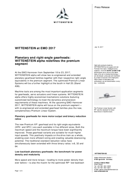 At the EMO Hannover from September 18 to 23, 2017, WITTENSTEIN alpha will show two re-engineered and extended planetary gearhead families together with their respective right-angle equivalents in the premium segment. The optimized Premium Linear Systems will be a further highlight at the booth in Hall 25 (Stand A36).