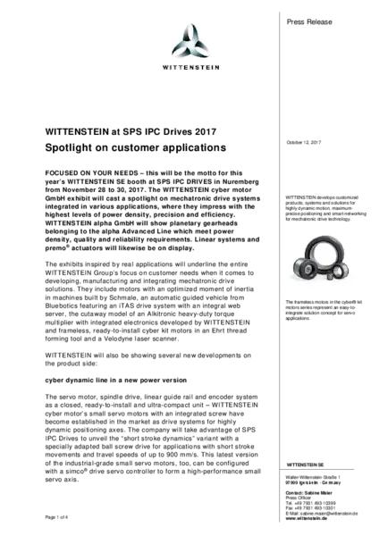 All of the above-mentioned product and system innovations will be described in detail in the WITTENSTEIN SPS IPC Drives press kit. The press kit will be handed out to you at our booth in Nuremberg.