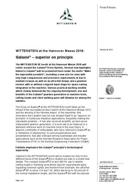 Innovations linked to the Galaxie® Drive System will be presented to the trade press at the traditional WITTENSTEIN SE press briefing at the Hannover Messe 2018.