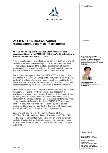 Khoi Vu will be Head of WITTENSTEIN motion control in the US with management responsibility for engineering and research & development, among others. Kasper Rungfeldt, M.Sc., can look back on nearly 30 years of experience around the world in executive positions in the energy, defense, aerospace and maritime industries. He was appointed Managing Director of WITTENSTEIN motion control in 2018 with responsibility, for example, for sales and production. He is also manager for the German and British sites as well as for WITTENSTEIN High Integrity Systems (GB).
